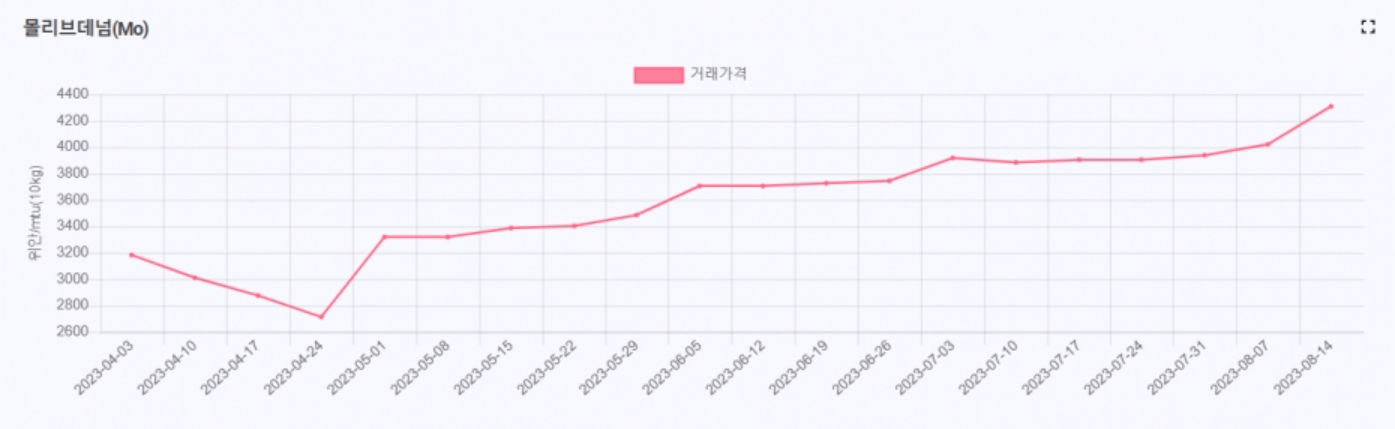 8월 중순, 기준가격(벤치마크)으로 통용되는 중국 시장 몰리브데넘 현물 가격은 10kg(1MTU)당 4,300위안(45~50% 응축재 기준)에서 거래되고 있다. 올해 4월 하순 대비 55%이상 급등했다. 특히 글로벌 시장에선 5월 이후 꾸준하게 상승하고 있는 가격 흐름 때문에 몰리브데넘을 조기 확보하려는 움직임이 활발해지면서 거래량도 증가하고 있다.