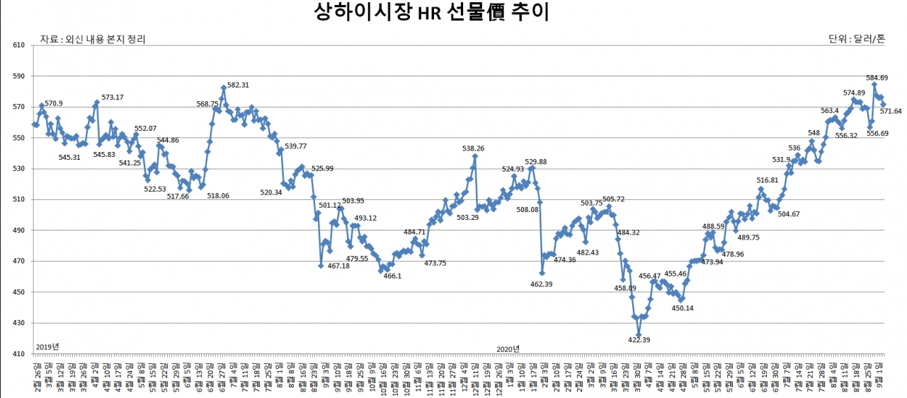9월 첫째 주, 상하이거래소 열연 선물거래가격은 톤당 577.2달러(3,947위안)를 기록했다. 전주 대비 톤당 12달러 급등했다. 특히 지난 31일 가격은 톤당 584달러까지 치솟으며 최근 1년 중 가장 높은 가격대를 형성했다.